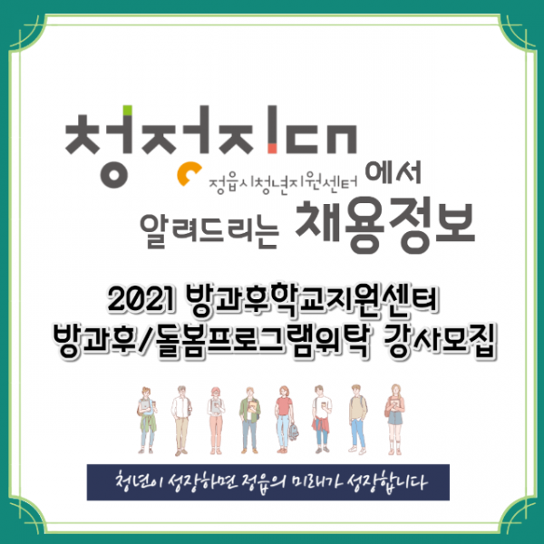 설명 구분 취업정보 제목 2021년 방과후학교지원센터 강사모집 등록일 등록일 21-01-25 16:49 첨부 BBSFILEEmployment.hwp (32.0K) 228회 다운로드 본문 정읍시청년지원센터 청정지대 이전글취업정보 창업정보 지원사업 내장산 콜 관제센터 상담원 채용공고 다음글2021년 제 9회 정읍시 공무직 채용 재공고 목록