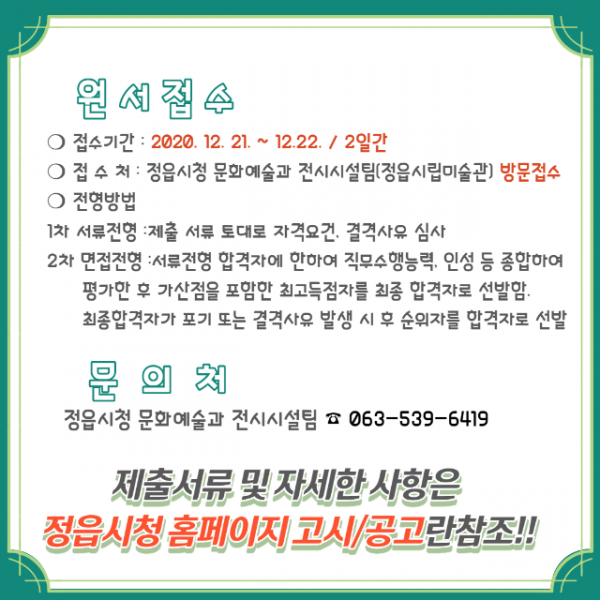 | 제목 | 2021년 정읍시립미술관 기간제근로자(학예연구원) 채용공고 |