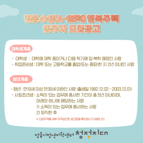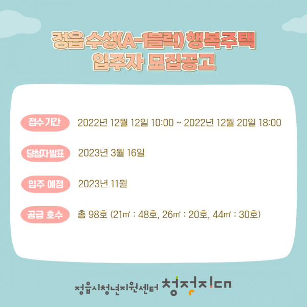 | 첨부 | ★정읍수성A-1블록행복주택모집공고문_20221201 2.pdf (628.7K) 349회 다운로드 |