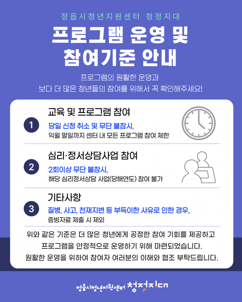 설명 제목 정읍시청년지원센터 청정지대 [프로그램 운영 및 참여기준 안내] 등록일 등록일 26-01-26 13:03 본문 063-536-0333 이전글「2026 청년도전지원사업」 매니저 채용공고 4차 다음글「2026 청년도전지원사업」 매니저 채용공고 3차 목록