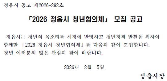 | 제목 | 2026 정읍시 청년협의체 모집 공고 |
